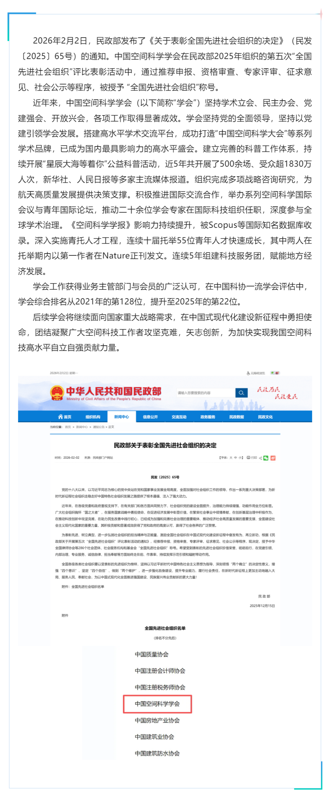 中国空间科学学会被民政部授予“全国先进社会组织”称号